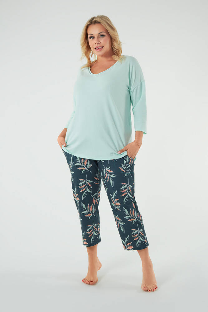 Piżama damska to propozycja dla kobiet ceniących elegancję oraz wygodę. Posiada luźny fason, który z pewnością doceni wiele kobiet. Zestaw zawiera utrzymaną w jednolitym kolorze bluzkę z dekoltem w serek oraz rękawem o długości 3/4. Drugą część kompletu piżam damskich stanowią spodnie o długości 7/8 z wpuszczanymi kieszeniami i efektownym nadrukiem w liście, który wnosi mnóstwo uroku. Warto dodać, że jest to piżama z bawełny – miękkiej, wygodnej i przyjemnej w dotyku. Całość dostępna jest w ponadczasowych, łagodnych kolorach, dzięki czemu możesz wybrać idealny model dla siebie.