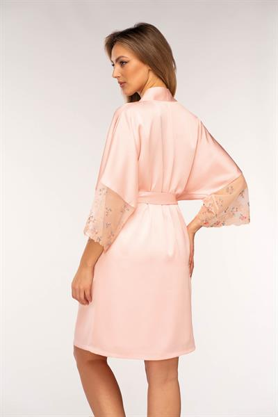Krótki szlafrok Tasha, podkreśla atuty kobiecego ciała. Wykonany został z przyjemnej dla ciała satyny w kolorze morelowym. Wiązany jest w pasie. Posiada rękawy o długości ¾ wykończone delikatną koronką. Stanowi kwintesencję kobiecości w niezwykle modnym i efektownym wydaniu.