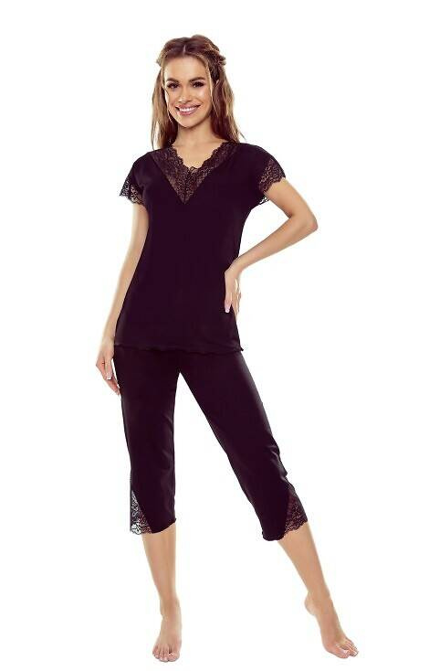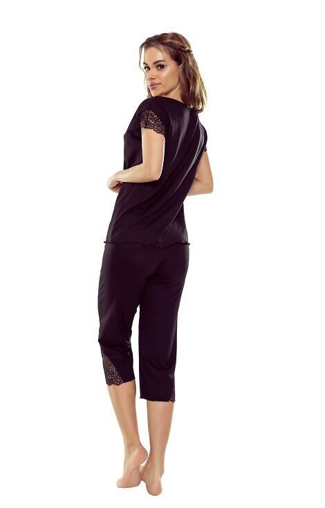 Elegancka piżama damska wykonana z wysokiej jakości miłej w dotyku wiskozy. Dekolt obszyty koronką. Do kompletu rybaczki o luźnym fasonie.