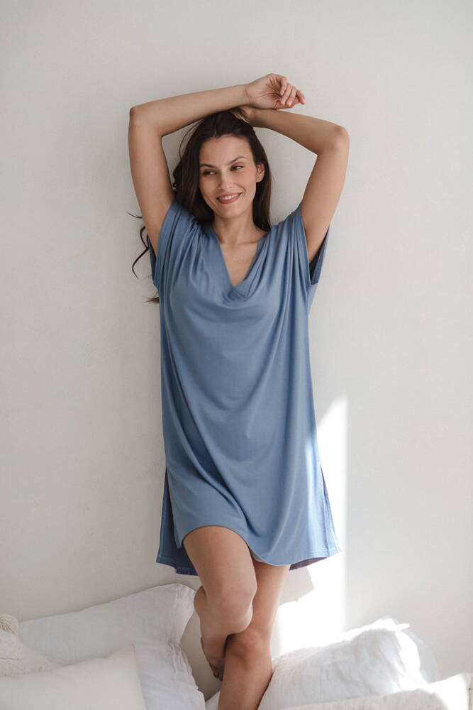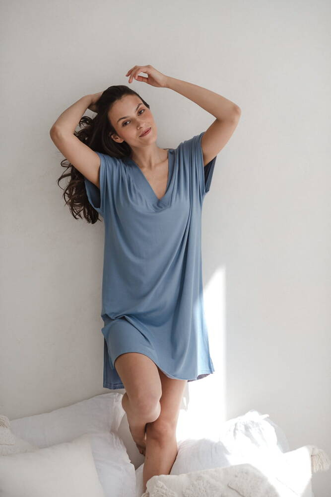 Koszula uszyta z wysokogatunkowej wiskozy bambusowej z dodatkiem elastanu, dzięki czemu nie "wyciąga się" i po praniu wraca do pierwotnego kształtu. Niezwykle elastyczna, dlatego świetnie sprawdzi się jako sukienka porodowa.