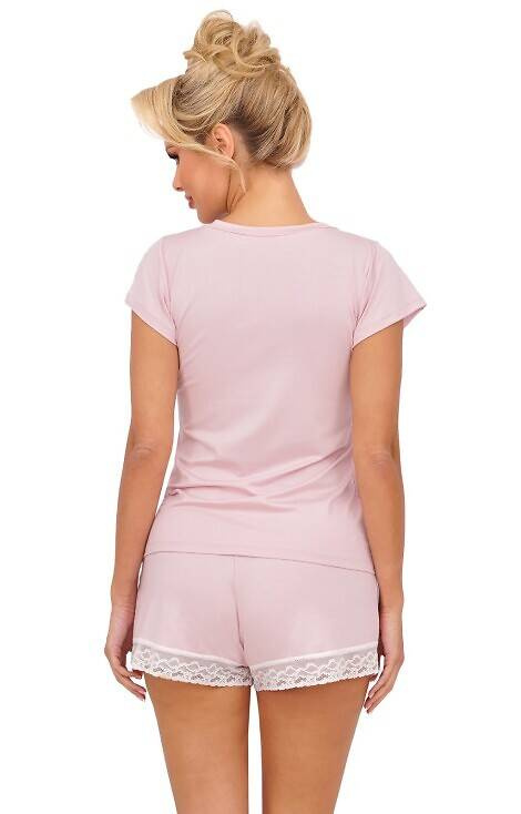Piżama damska wykonana  z delikatnej wiskozy. Koszulka z krótkim rękawem i dekoltem w kształcie litery ,,V". Do kompletu luźne, wygodne szorty zakończone koronką.