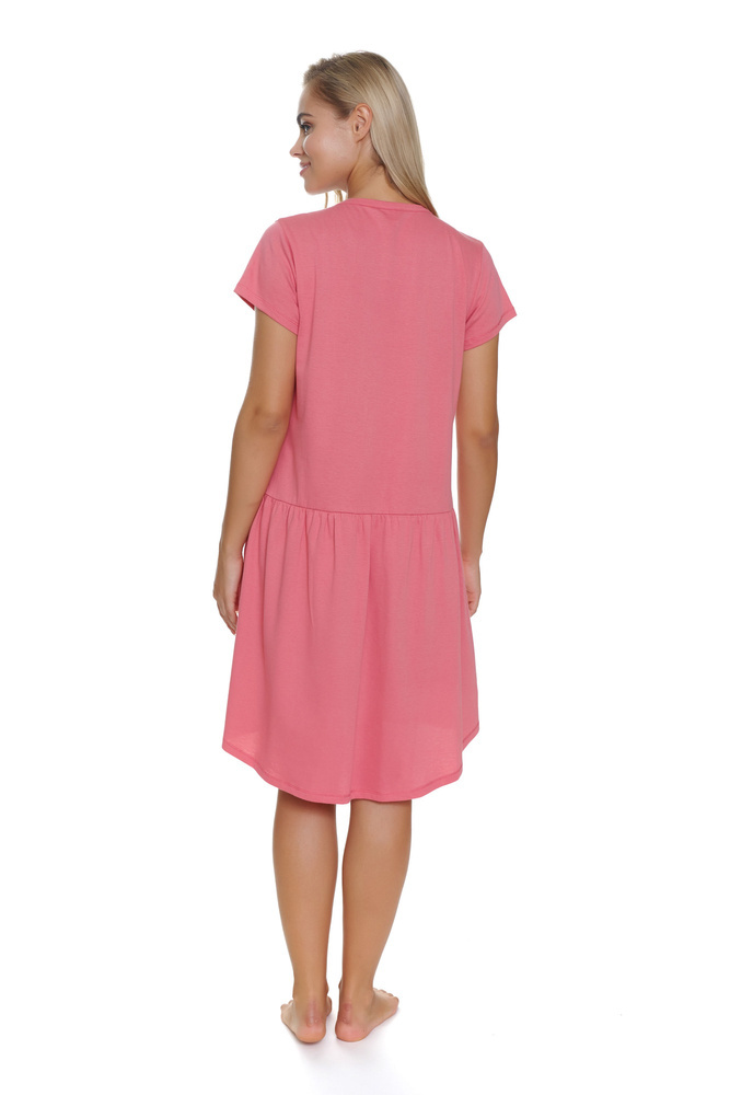 Koszula nocna Doctor Nap 9445 to połączenie wygody i dziewczęcego uroku. Model uszyto w 100% z naturalnej, miękkiej bawełny, dzięki czemu jest przyjazny dla skóry i doskonale sprawdza się w ciąży oraz podczas karmienia piersią. Praktyczne zapięcie na guziki ułatwia dostęp do piersi, a luźny, odcinany krój zapewnia komfort i swobodę ruchów. Krótki rękaw i modny fason sprawiają, że koszula świetnie prezentuje się także jako homewear. Polska produkcja to gwarancja jakości.