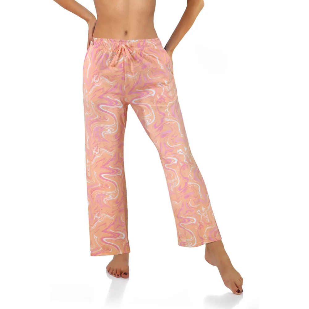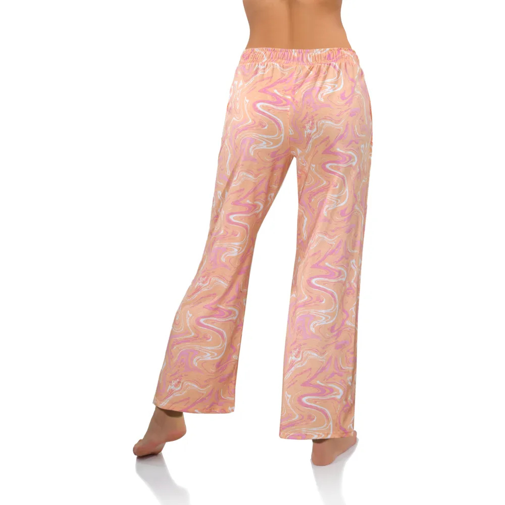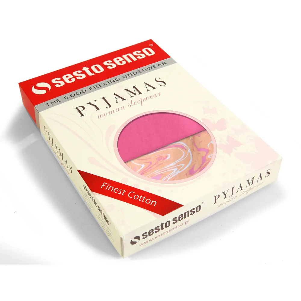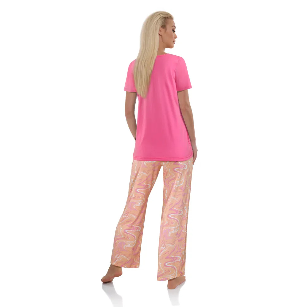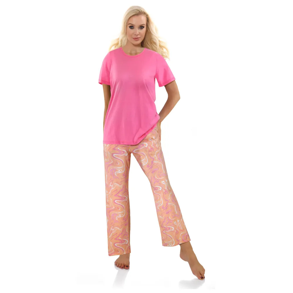 Stylowa piżama damska z krótkim rękawem i długimi spodniami. Wygodna i miękka w dotyku. Gładka koszulka oraz spodnie rozszerzone u dołu nadają piżamie niepowtarzalny styl. Przemyślany krój zapewnia komfort użytkowania i sprawia, że piżama wygląda wspaniale na każdej sylwetce. Idealna do spania i jako praktyczny strój domowy.