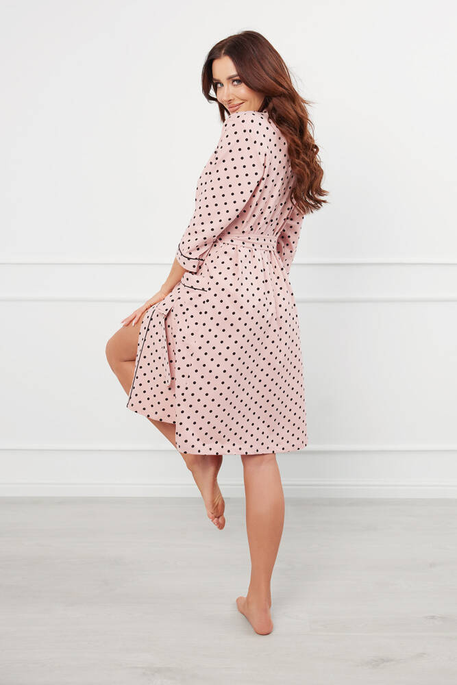 kraj produkcji: POLSKACienki szlafrok damski Bonilla łączy komfort z klasycznym stylem. Został wykonany z delikatnej, 100% bawełny, która gwarantuje doskonałą oddychalność i miękkość. Subtelny, pudrowo-różowy odcień harmonijnie współgra z czarnymi kropkami oraz czarnymi lamówkami, dodając całości wyrafinowanego charakteru. Model z rękawem o długości ¾, charakteryzuje się również prostym krojem, który świetnie leży na różnych typach sylwetek, a wiązany pasek w talii pozwala na podkreślenie figury. Długość do kolan zapewnia komfort i swobodę ruchów, czyniąc go idealnym wyborem zarówno na poranne, jak i wieczorne chwile relaksu.