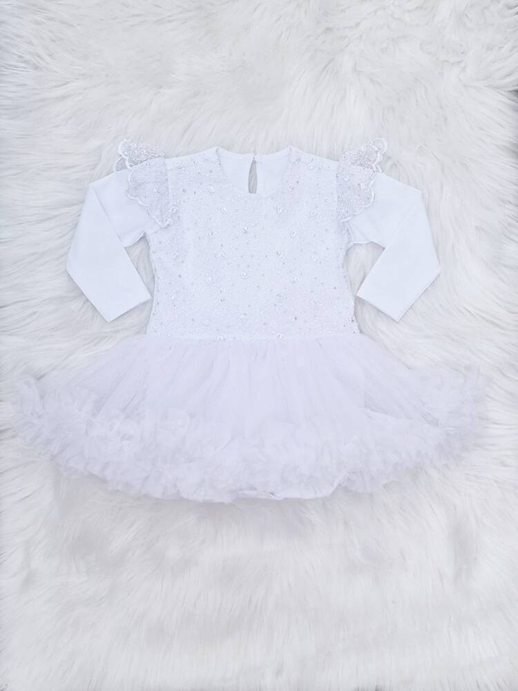 Body ma doszytą tiulową spódniczkę oraz ozdobne rękawki.