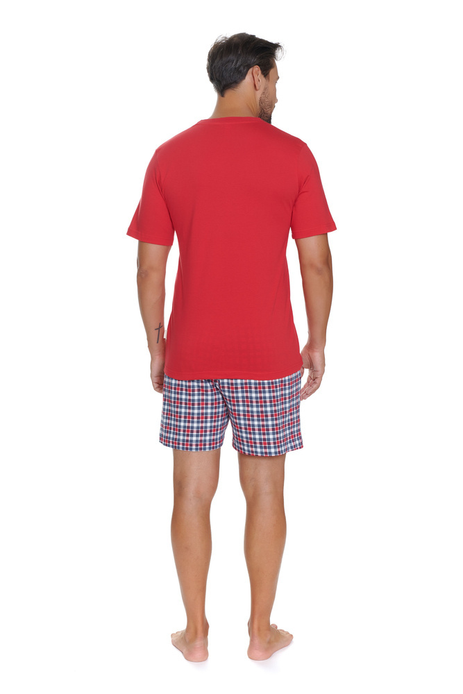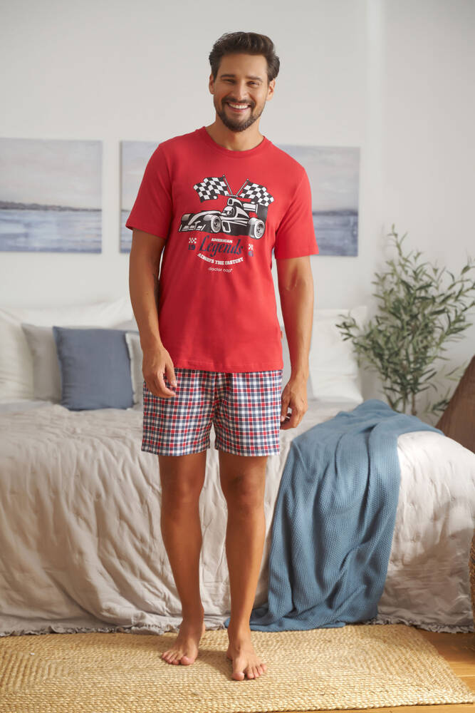 Piżama męska wykonana z wysokiej jakości miękkiej bawełny. Model o klasycznym kroju. Koszulka z krótkim rękawem, dekolt półokrągły. Spodnie krótkie, wzorzyste, wykończone komfortową gumką w pasie. Spodoba się najbardziej wymagającym mężczyzną.