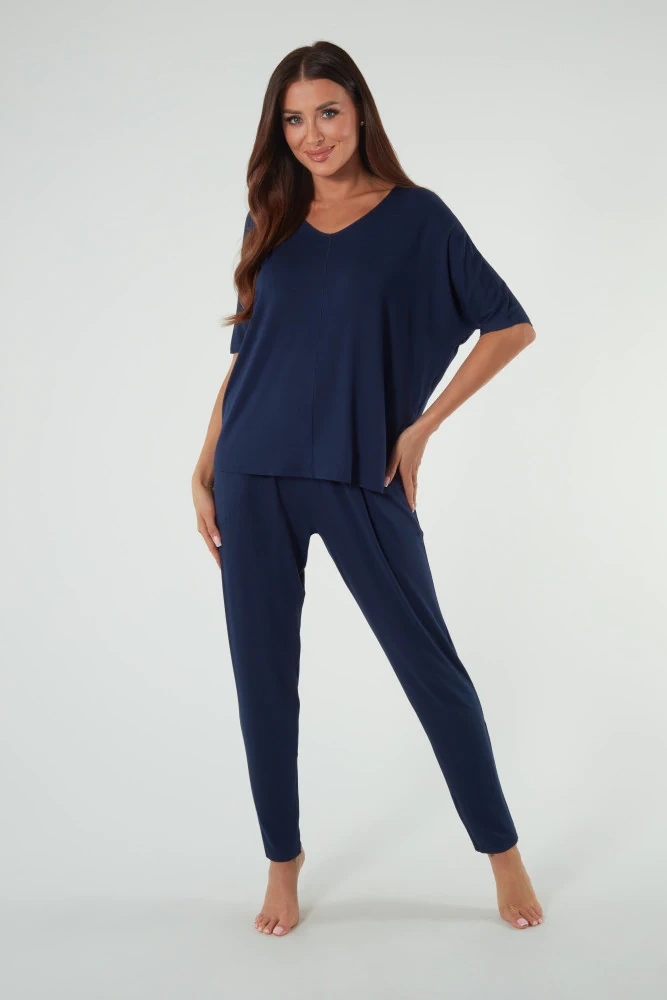 Komplet z wiskozy świetnie sprawdzi o każdej porze roku. Wiskoza chroni skórę przed zimnem, jednak struktura tej tkaniny jest oddychająca, dzięki czemu skutecznie reguluje temperaturę ciała. Ponadto delikatna i bardzo przyjemna w dotyku wiskoza zapewnia niezwykły komfort podczas snu, który dodatkowo uzyskujemy dzięki bezuciskowej gumce w spodniach i luźnym kroju. Uroku kompletowi dodaje oryginalny i nieco fikuśny fason. To idealny wybór dla osób, które przede wszystkim stawiają na wygodę z klasą.