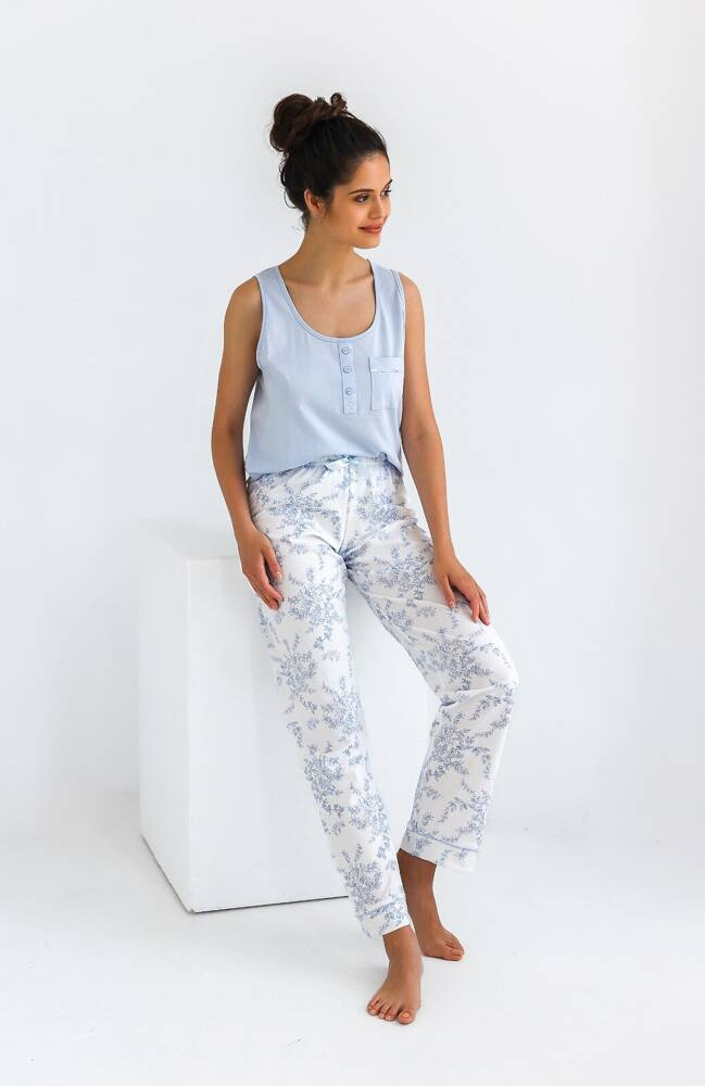 Letnia piżama damska - koszulka na szerokich ramiączkach , dekolt zdobią guziki. Do kompletu luźne, długie spodnie z wzorzystej bawełny. Pas z satynową kokardką.