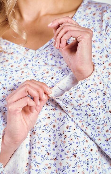 Koszula damska z długim rękawem zakończonym delikatną falbanką. Całość uszyta z wysokiej jakości wzorzystej bawełny. Okrągły w szpic. Długość do kolana.
