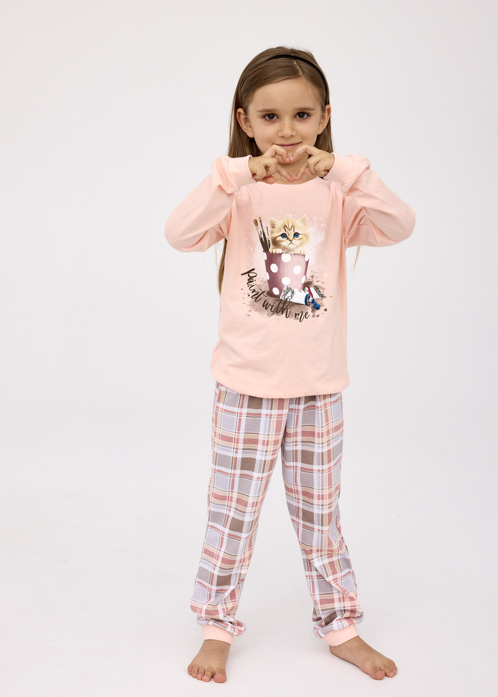 Piżama uszyta z wysokiej miękkiej bawełny. Koszulka z długim rękawem, przód ozdobiony kolorowym nadrukiem. Do kompletu długie w kratę spodnie. Dekolt, mankiety oraz dół koszulki z nogawki zakończone wygodnym ściągaczem. Piżamka pakowana w pudełko.
