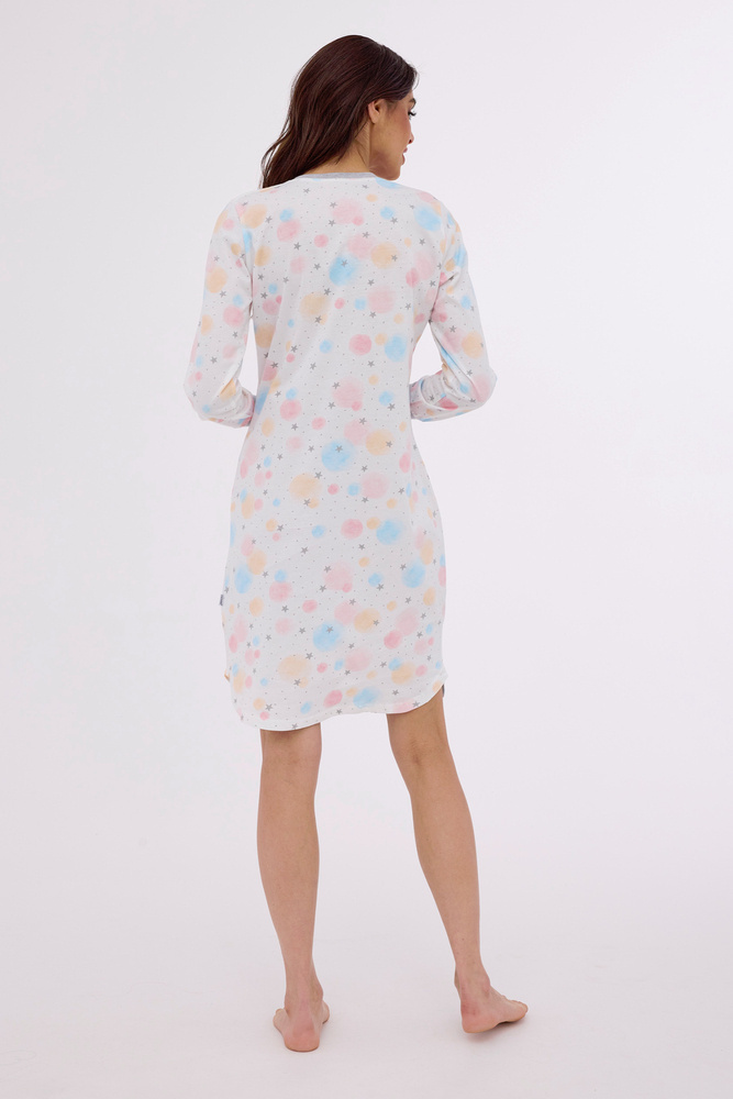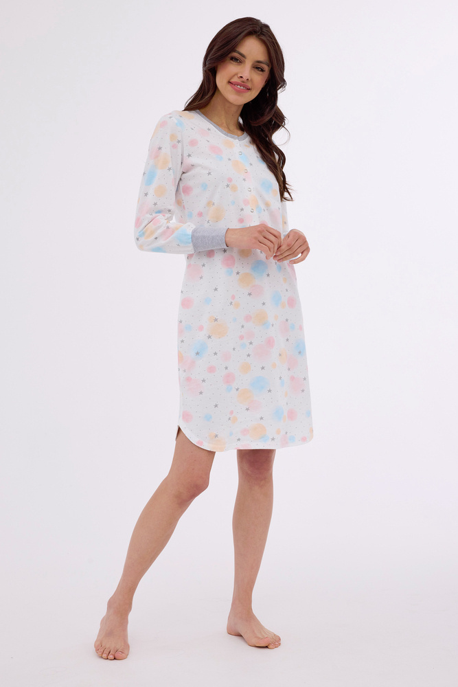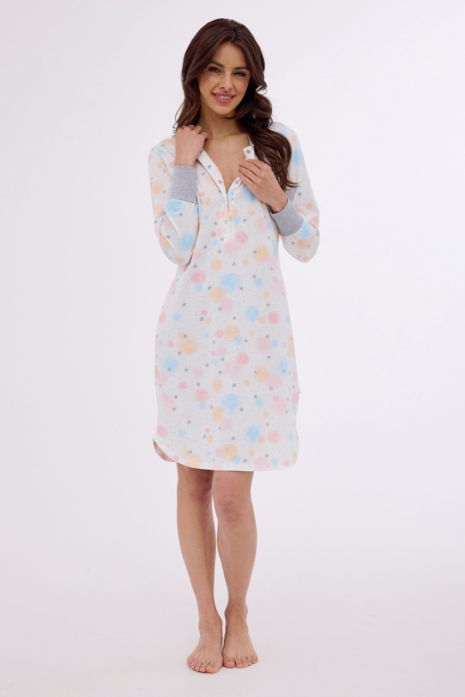 Koszula damska przeznaczona dla mam karmiących. Koszulka damska z długim rękawem, zakończonym ściągaczem uszyta z wzorzystej bawełny. Dekolt okrągły, rozpinany. Dół lekko zaokrąglony. Długość przed kolano. Pakowana w pudełko.