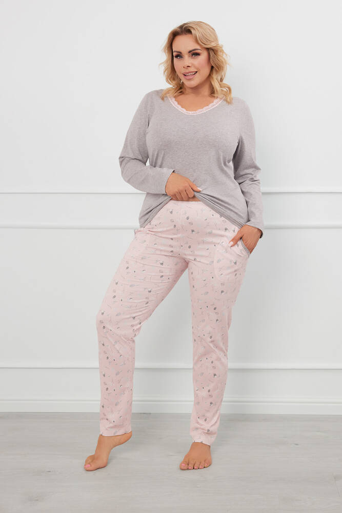Spodnie zdobione wzorem w żołędzie i bluza wykończona dekoltem w serek z uroczą koronką sprawiają, że ta damska piżama z długimi spodniami i długim rękawem wygląda bardzo ciekawie. Z pewnością jest wygodna – ma prosty, klasyczny krój oraz naturalny, przyjemny dla skóry i oddychający materiał. Bawełniana damska piżama zapewni swobodę ruchów i komfort podczas snu, a delikatny, ale śliczny wzór przypadnie do gustu każdej kobiecie. Spodnie posiadają także funkcjonalne kieszonki. Damska piżama dostępna jest w rozmiarach od S do XXL i ma odcienie różu i melanżowej szarości.