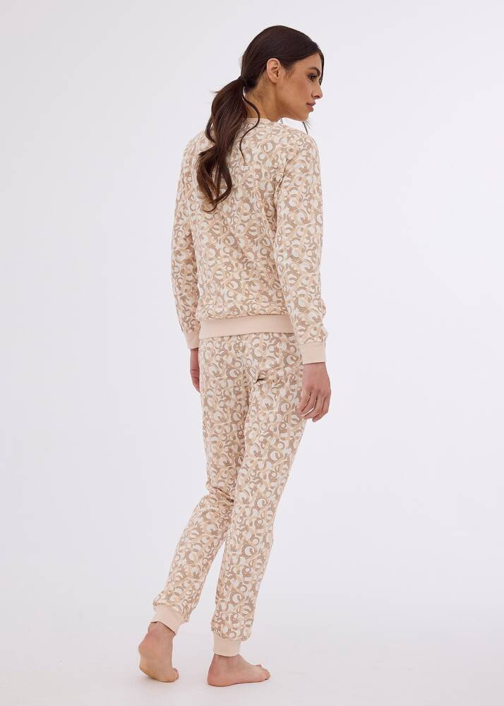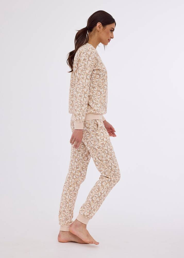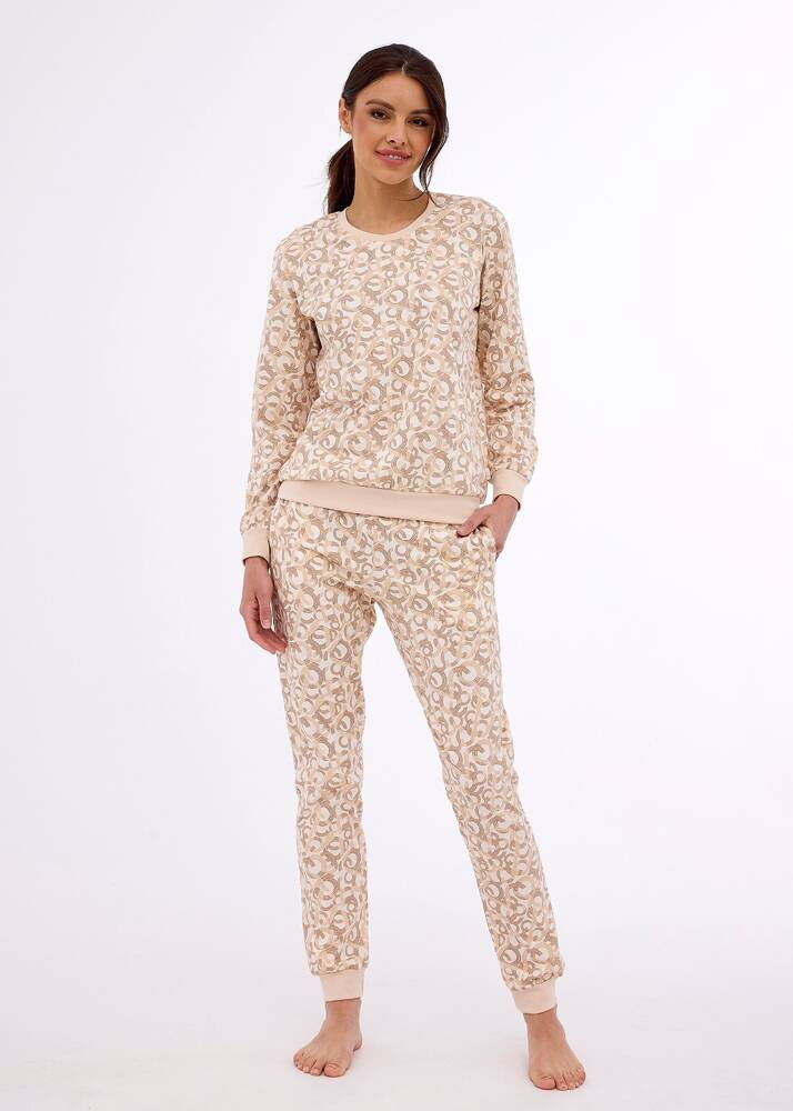 Wygodna piżama damska wykonana z wysokiej jakości wyjątkowo miłej i miękkiej bawełny. Bluzka z długim rękawem, zakończonym ściągaczem, dekolt okrągły. Do kompletu długie spodnie z kieszeniami, nogawki zakończone ściągaczem. Pakowana w pudełko.