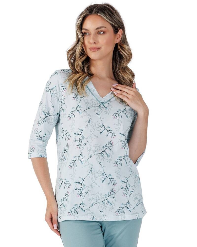 Piżama damska uszyta z wysokogatunkowej bawełny. Koszulka z rękawem 3/4 wzorzysta, dekolt w kształcie litery V. Do kompletu spodnie jednolite spodnie typu rybaczki