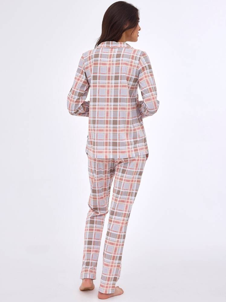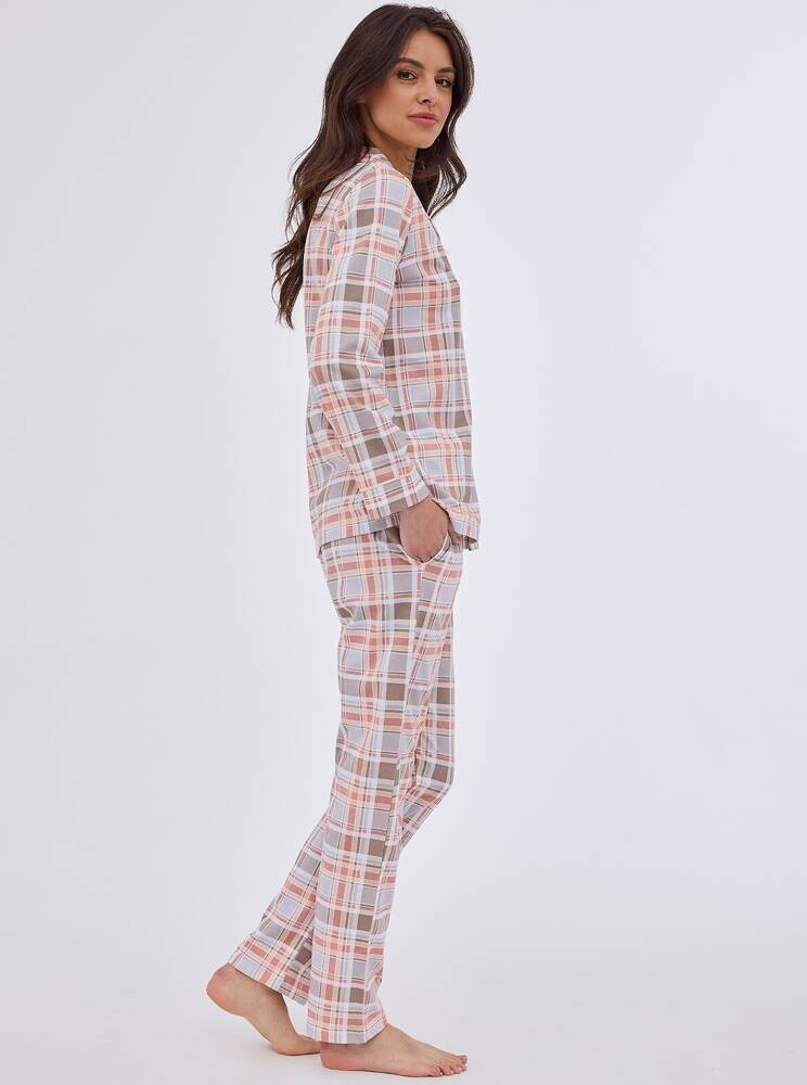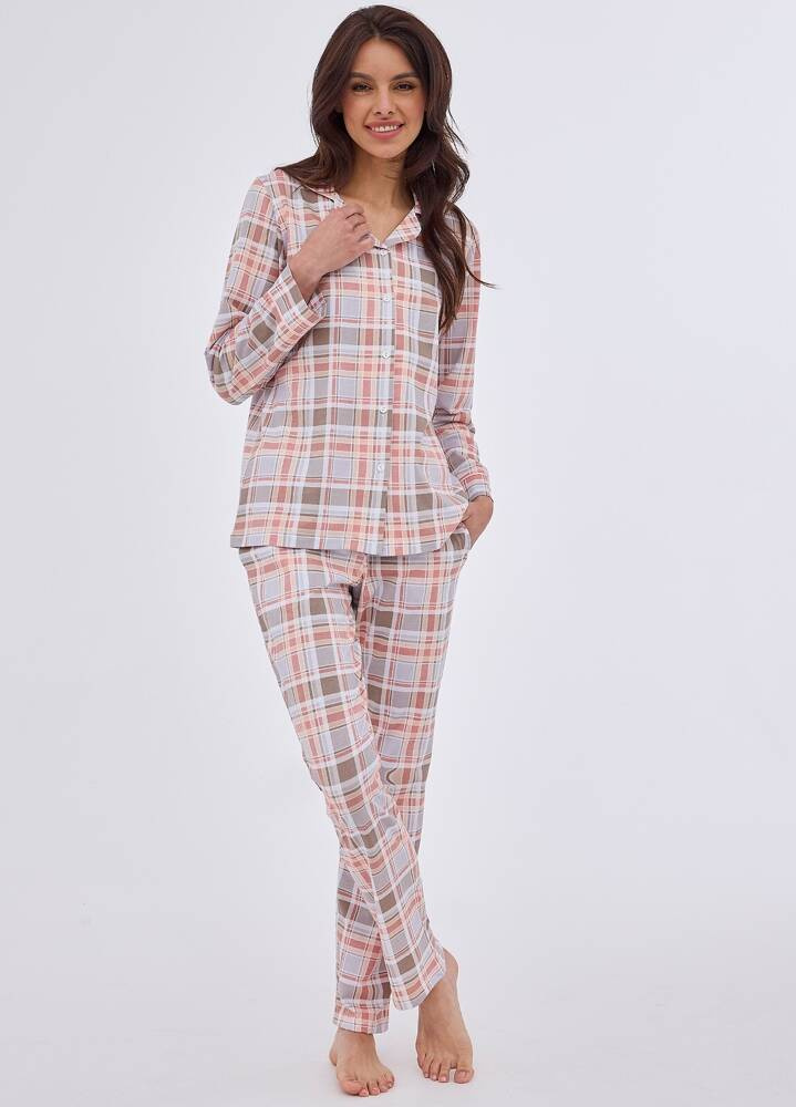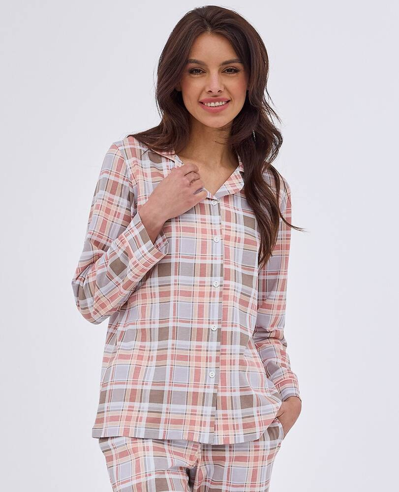 Piżama damska z wysokiej jakości wzorzystej bawełny. Koszulka z długim rękawem, zapinana na guziki. Do kompletu długie spodnie. W pasie wygodna gumka.