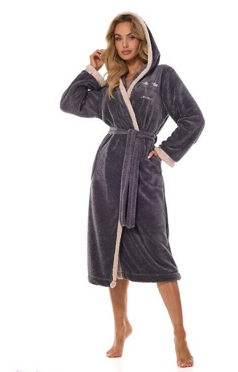 Długi szlafrok damski z kapturem ozdobiony delikatną aplikacją