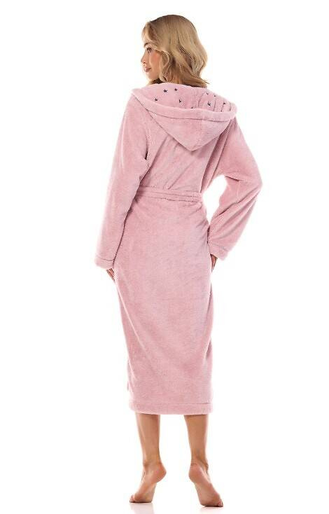 Długi szlafrok damski z kapturem ozdobionym haftem w gwiazdki.