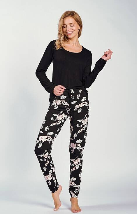 Piżama damska z wysokiej jakości wiskozy z bawełną. Koszulka z miłej dla ciała prążkowanej wiskozy z długim rękawem. Długie spodnie z bawełny o kwiatowym princie. W pasie gumka obszyta dzianiną.