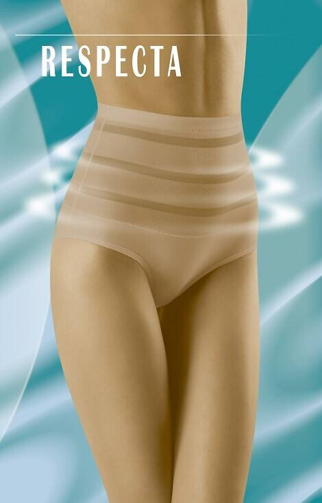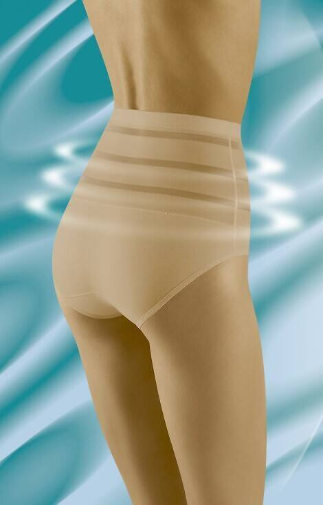 Figi damskie modelujące sylwetkę z wysokiej jakości mocno opinającej dzianiny. Idealnie podkreślają linię talii oraz opinają brzuch. Ozdobione paskami z transparentnej siateczki. Dół wykonany z miękkiej mikrofibry. Pas od wewnątrz z sylikonem.