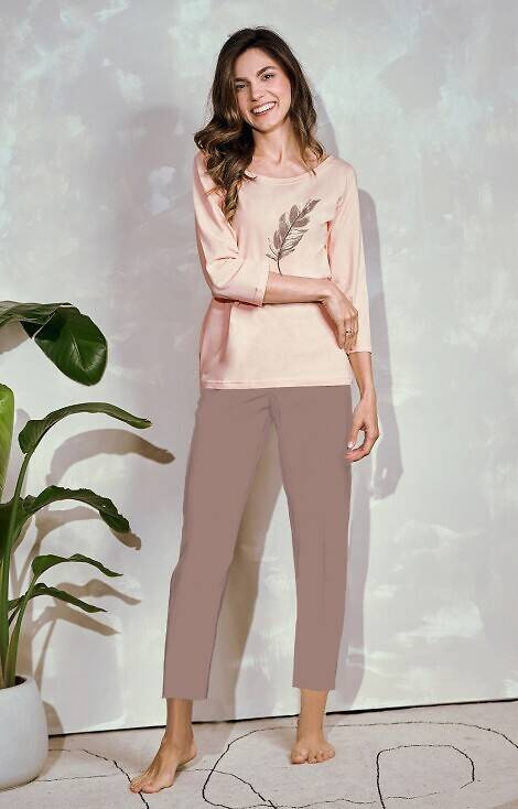 Piżama damska uszyta z wysokiej jakości bawełny.  Koszulka z rękawem 3/4 , dekolt półokrągły z delikatnym nadrukiem.