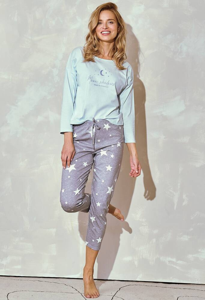 Piżama damska uszyta z wysokiej jakości bawełny. Koszulka z delikatnym nadrukiem, spodnie wzorzyste z wiązanym sznurkiem w pasie. Mankiety i nogawki o długości 7/8.
