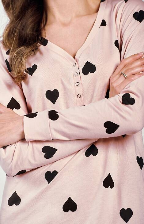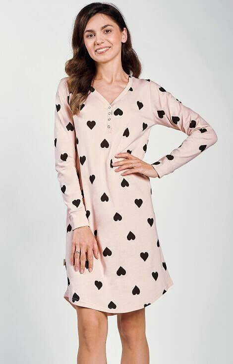 Koszula damska z długim rękawem, uszyta z wysokiej jakości bawełny. Ozdobiona wzorem w serca.Dekolt w kształcie litery "V", zapinany na zatrzaski. Długość do kolana .