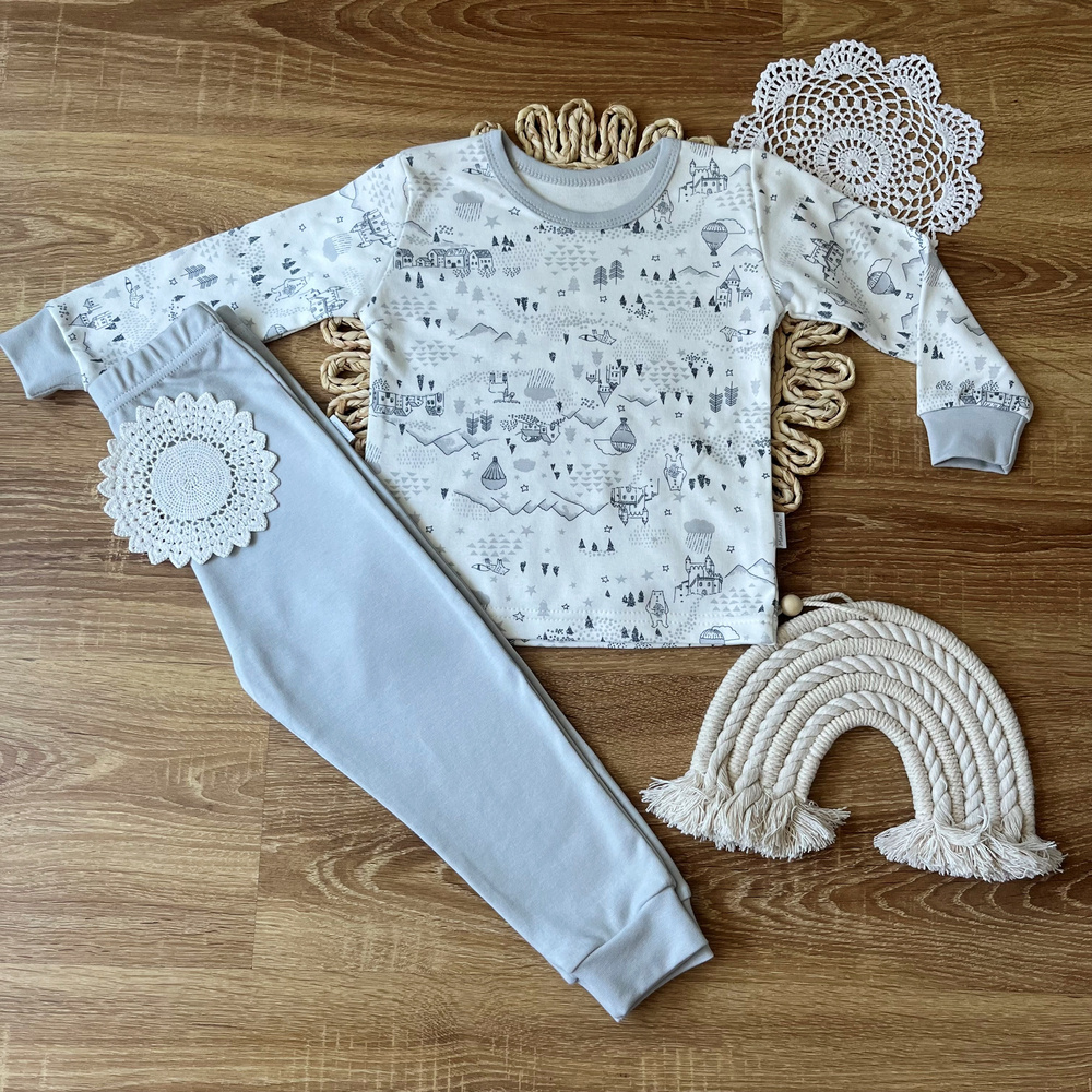 Dwuczęściowy komplet składający się bluzki z długim rękawem oraz długich spodni. Bluzka bawełniana w delikatny wzór, do kompletu gładkie spodnie zakończone ściągaczem.