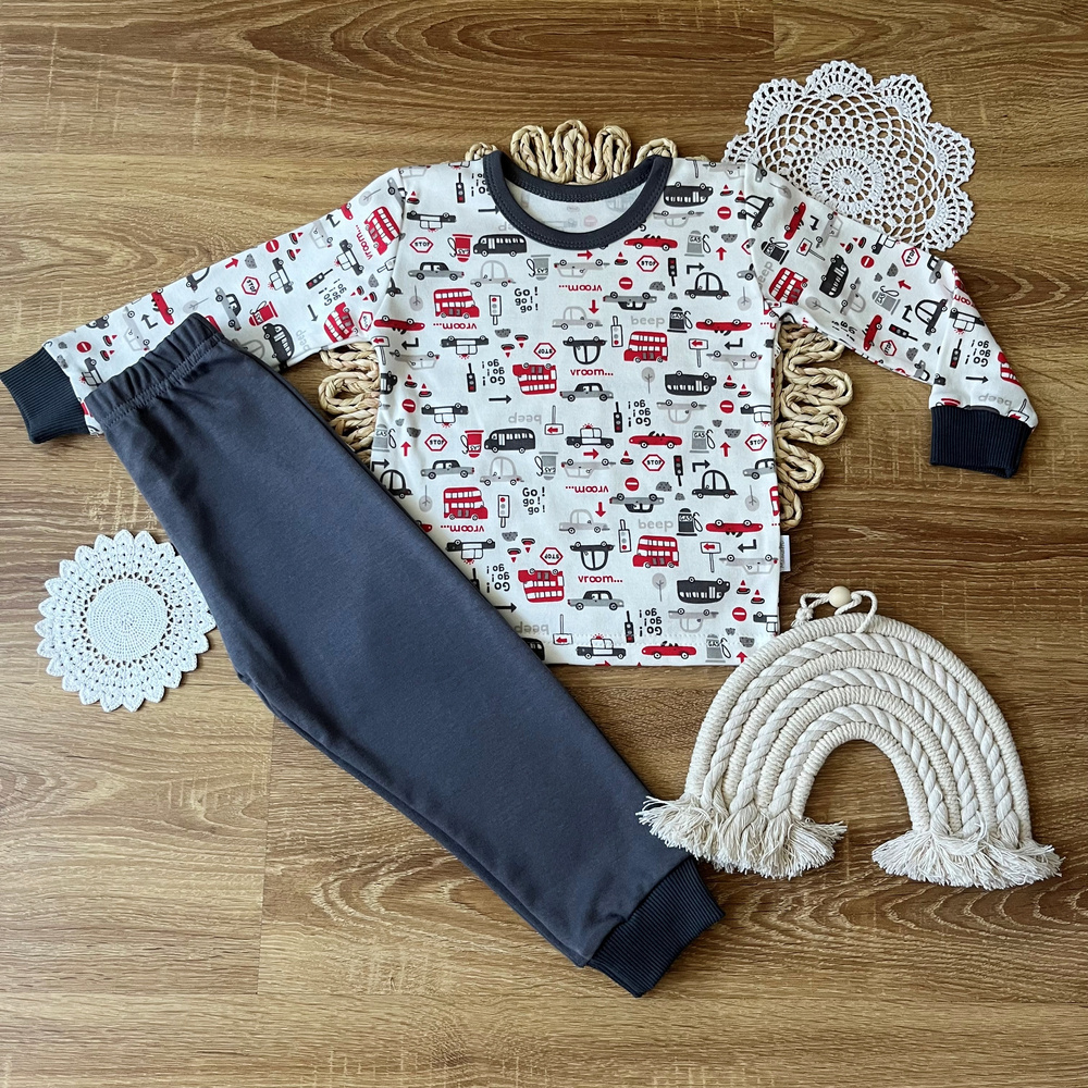 Dwuczęściowy komplet składający się bluzki z długim rękawem oraz długich spodni. Bluzka bawełniana w delikatny wzór, do kompletu gładkie spodnie zakończone ściągaczem.