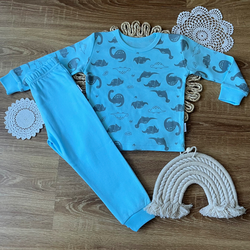 Dwuczęściowy komplet składający się bluzki z długim rękawem oraz długich spodni. Bluzka bawełniana w delikatny wzór, do kompletu gładkie spodnie zakończone ściągaczem.