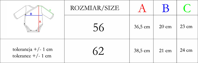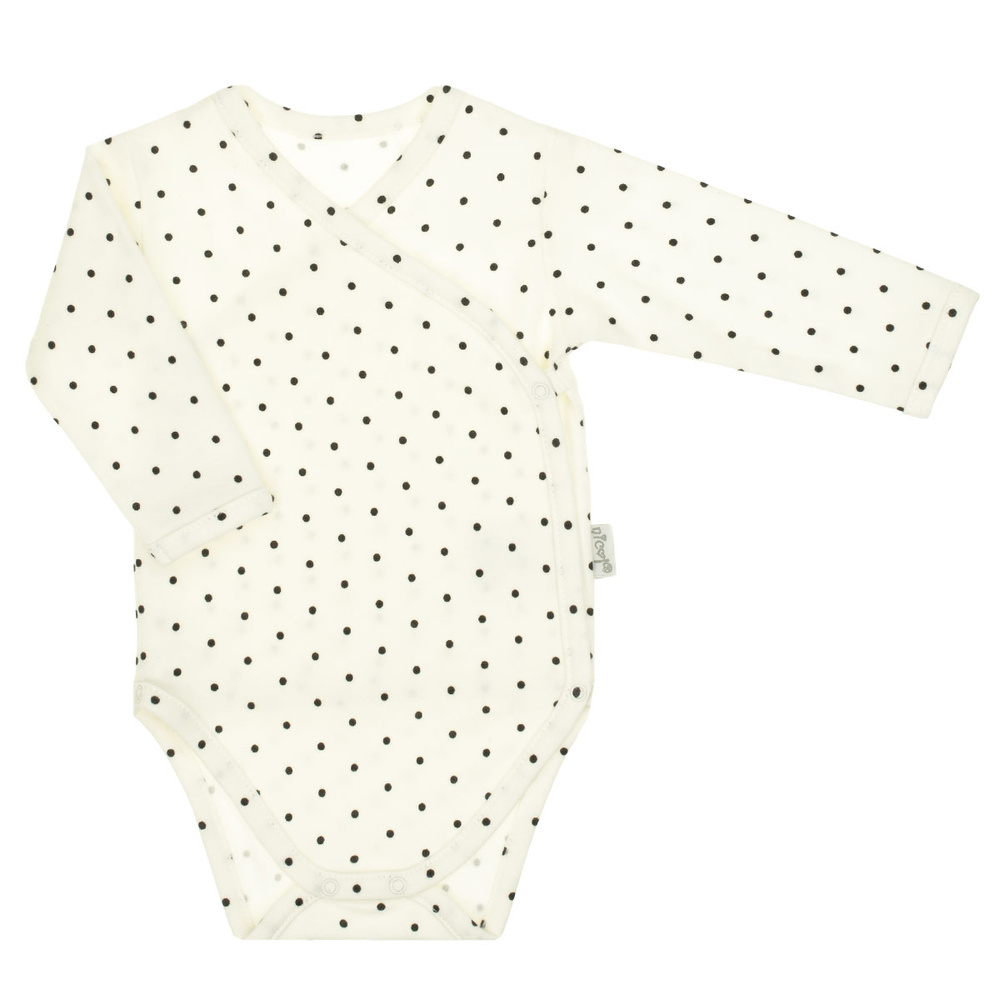 Kopertowe body z długim rękawem, uszyte z bawełny drukowanej. Produkt jest zapinany na bezniklowe napy. Model ten polecany jest dla noworodków, ponieważ zastosowane zapięcie ułatwia ubieranie dziecka. Materiał posiada certyfikat Oeko-Tex Standard 100 Tekstylia godne zaufania.