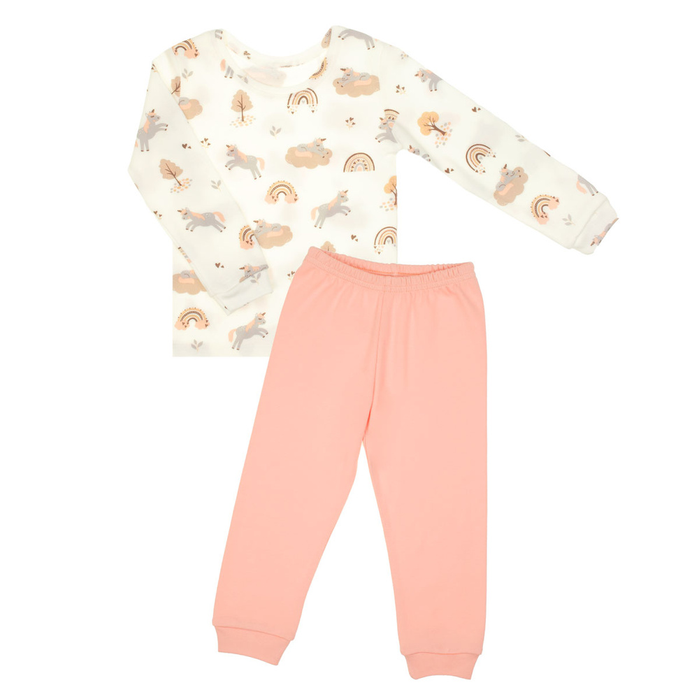 Bawełniana piżamka z luźną bluzką z długim rękawem. Spodnie posiadają w pasie wygodną gumkę nie uciskającą brzuszka, dodatkowo została przeszyta, aby zapobiec okręcaniu się. Dół nogawek zakończono ściągaczem. Spodnie w kolorze ecru, bluzka wzorzysta. Bawełna, z której jest uszyta, posiada certyfikat Oeko-Tex Standard 100 Tekstylia godne zaufania.