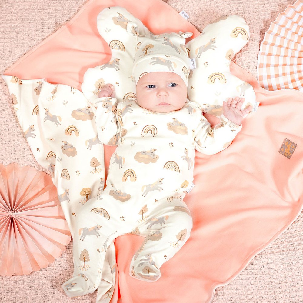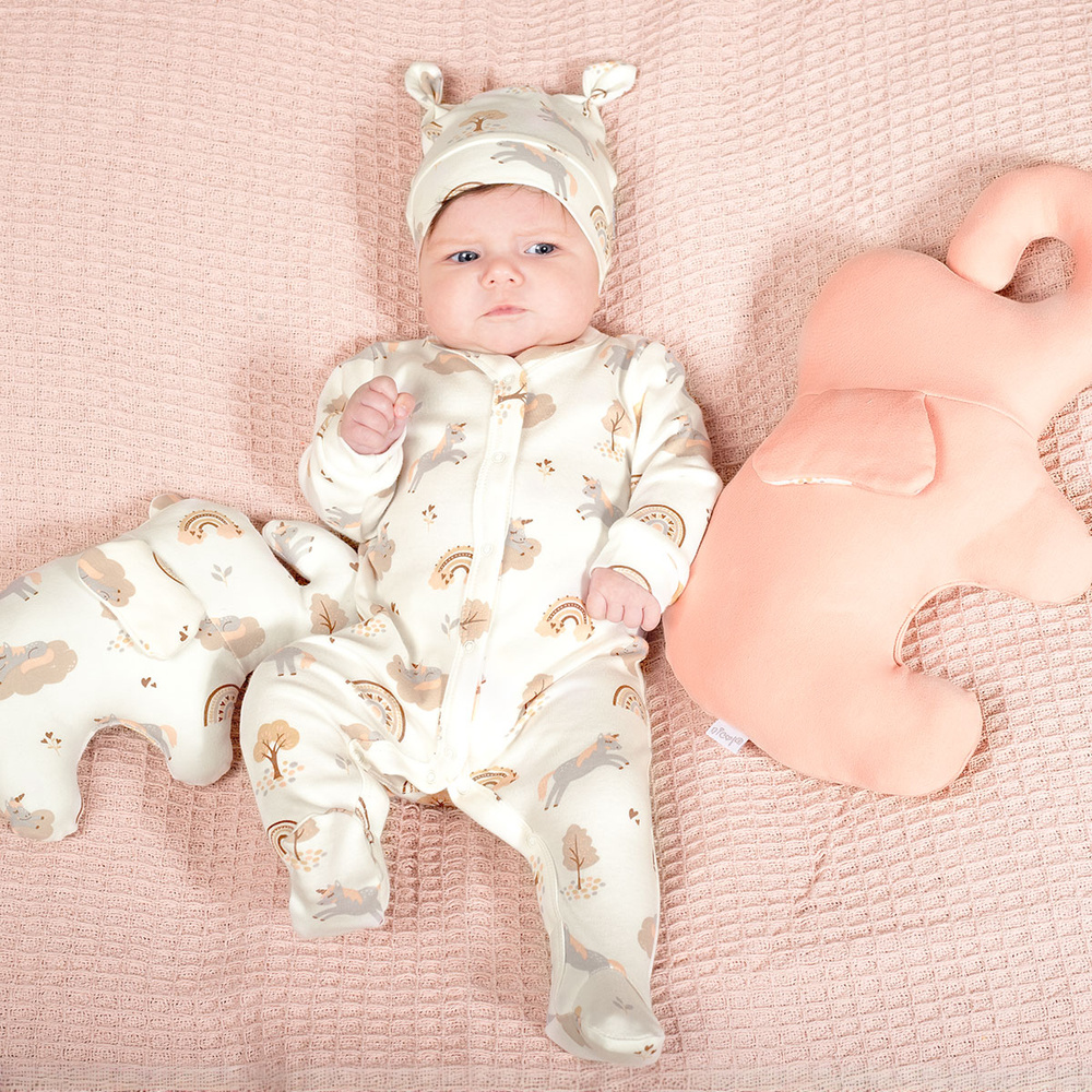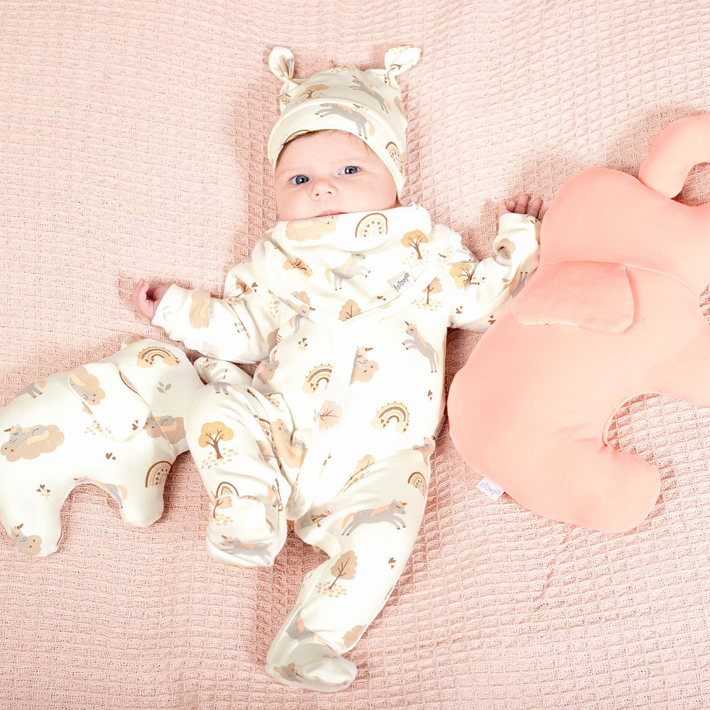 Praktyczna czapka uszyta z drukowanej bawełny. Niewielka ilość elastanu sprawia, że czapeczka będzie lepiej przylegać do główki. W fasonie tym, zastosowano bezuciskowy ściągacz. Czapeczkę zdobią uszka w formie zakładek. Materiał posiada certyfikat Oeko-Tex Standard 100 Tekstylia godne zaufania.