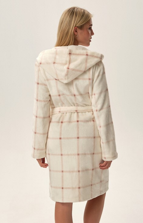 Miękka puszysta dzianina typu soft ozdobiona wzorem w kratkę .  Szlafrok posiada kaptur i kieszenie. Wiązany w pasie.