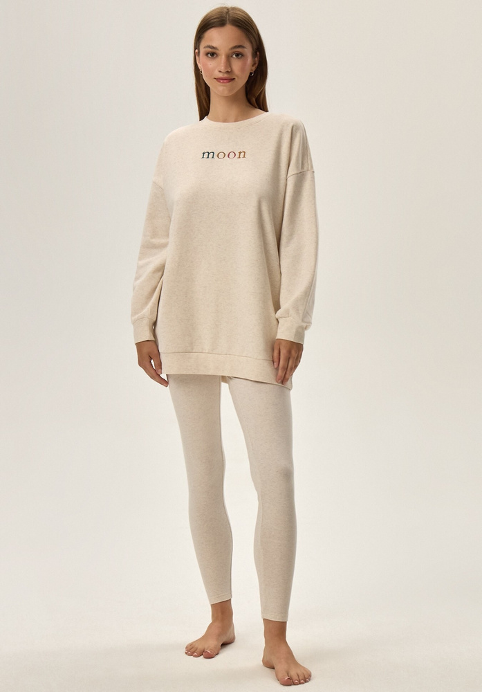 Piżama/ dres damski z miękkiej, gładkiej bawełny. Bluza z długim rękawem od wewnątrz ocieplana oraz ozdobnym napisem. Do kompletu długie spodnie typu legginsy . Rękawy oraz dół bluzy zakończone ściągaczem.