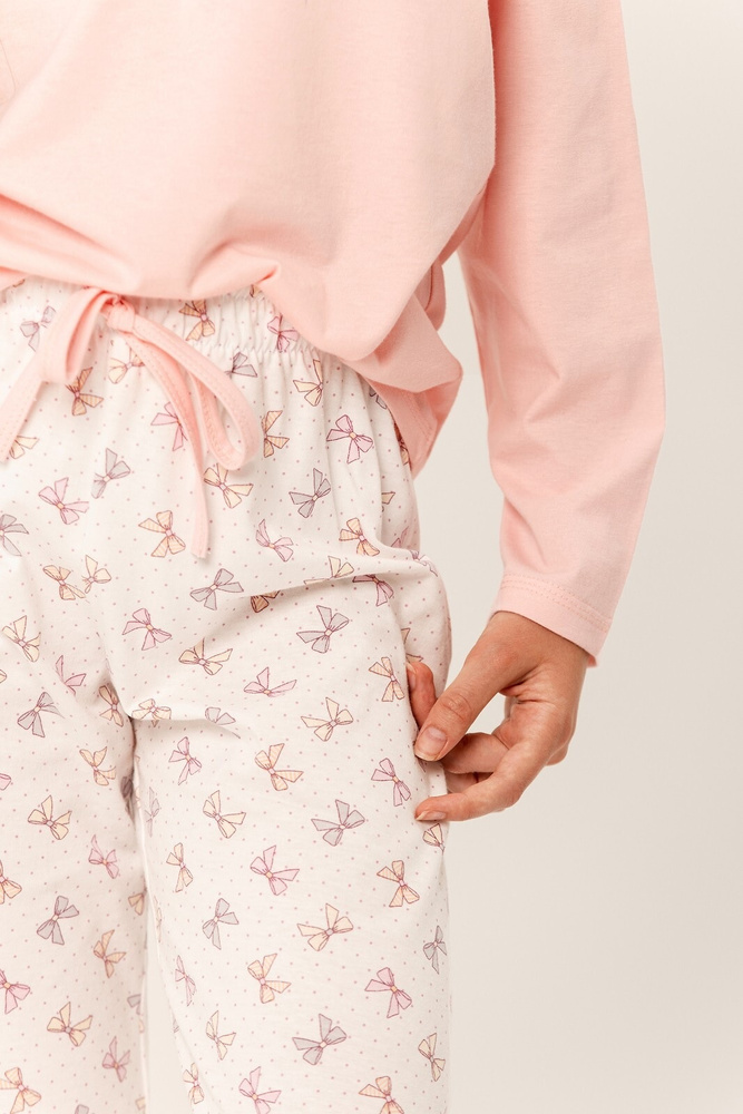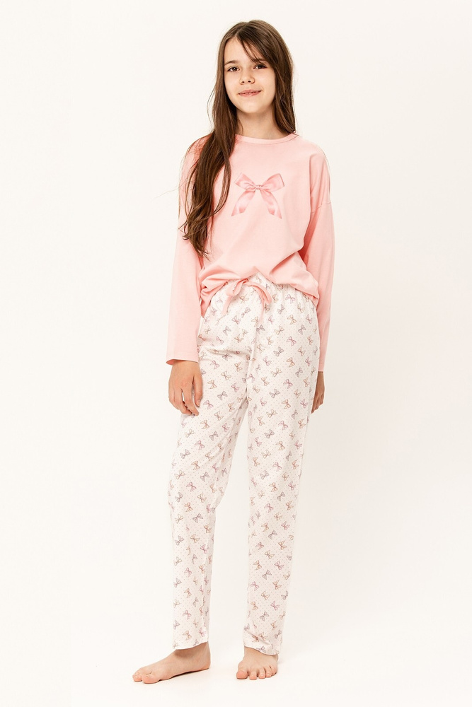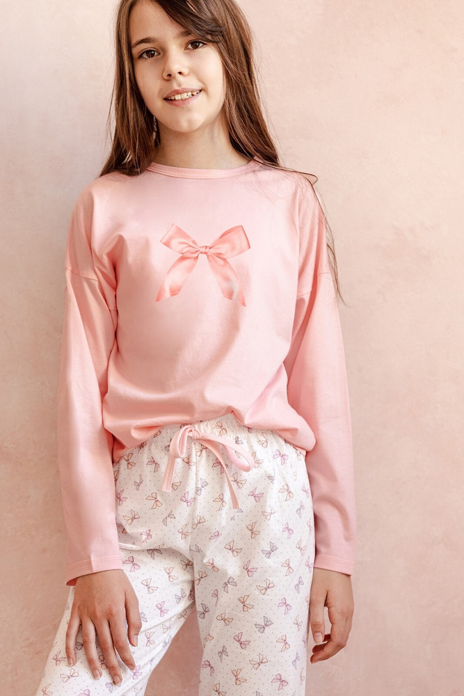 Piżama dziewczęca bawełniana, koszulka z długim rękawem oraz ozdobnym nadrukiem. Do kompletu długie spodnie