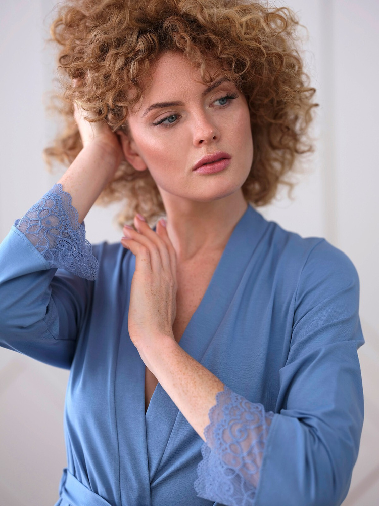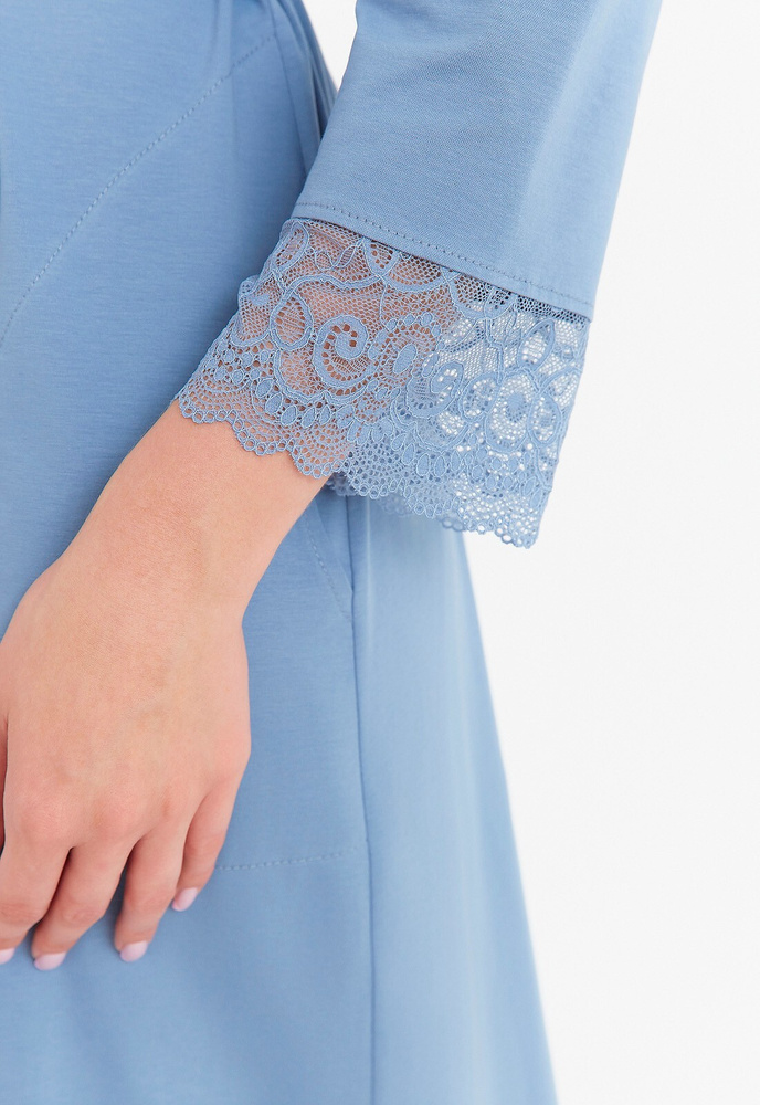 Wiązany w pasie, mankiety obszyte delikatną koronką.