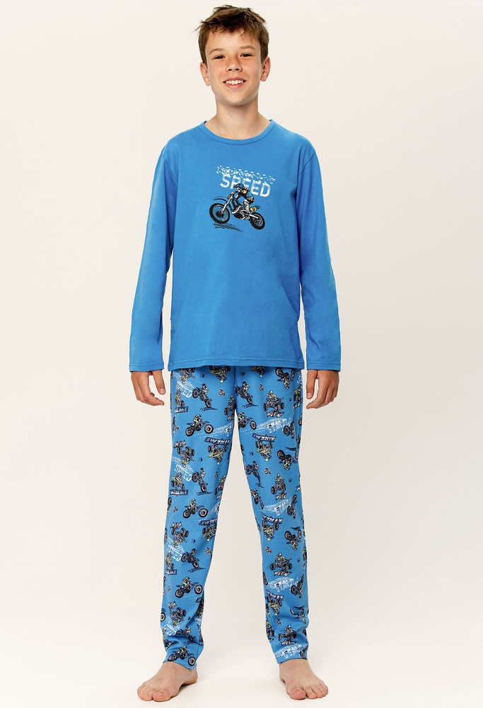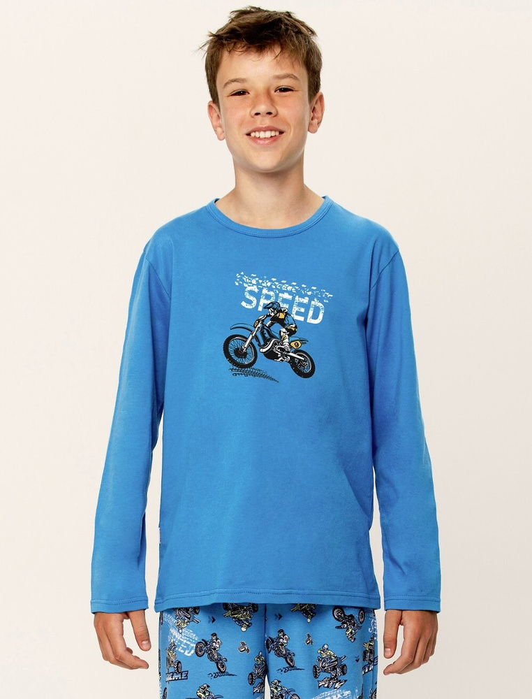 Koszulka z długim rękawem z nadrukiem, dekolt okrągły. Spodnie wzorzyste z długimi nogawkami