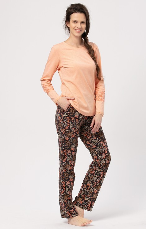 Piżama damska - koszulka z długim rękawem . Na rękawach delikatny wzór i koronka. Dekolt półokrągły. Spodnie długie wzorzyste . W pasie gumka obszyta bawełną.