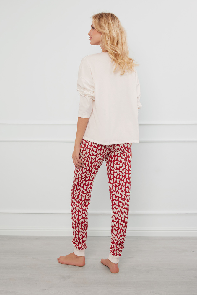 Długa piżama damska o prostym fasonie została stworzona z myślą o maksymalnej wygodzie. Górna część to bluzka z długim rękawem w jednolitym kolorze i z nadrukowanym napisem „FEEL THE LOVE”. Okrągły dekolt został wykończony kontrastowym obszyciem. Spodnie z romantycznym wzorem w serduszka zakończone są ściągaczami, co zapewnia doskonałe dopasowanie. Całość wykonana została z komfortowej i przyjemnej w dotyku bawełny.