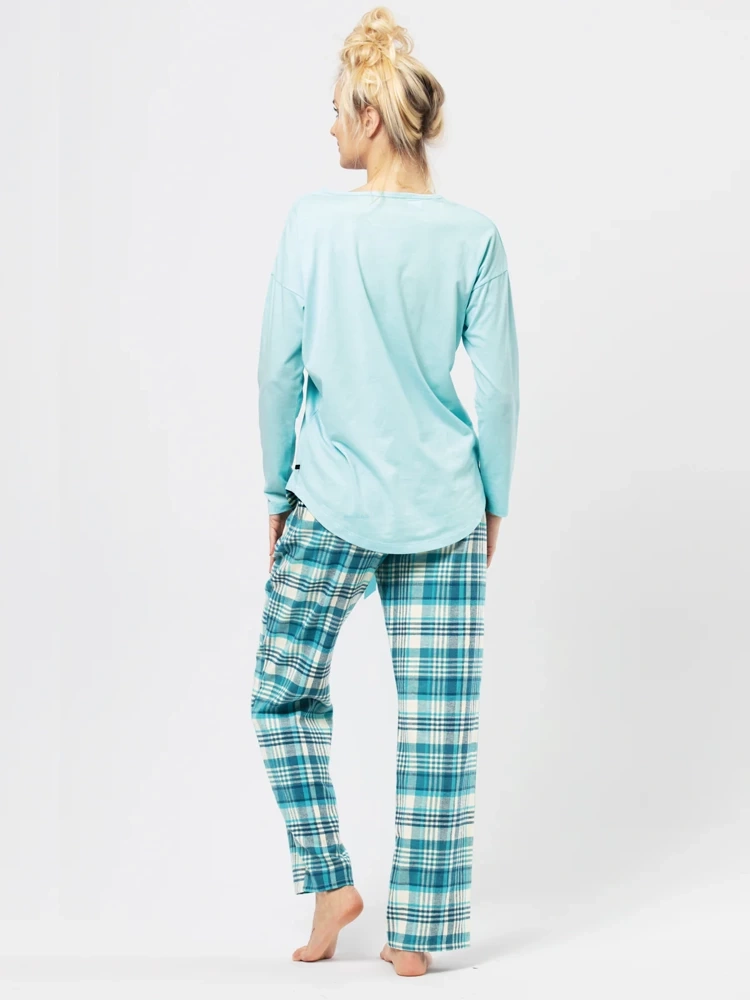 Piżama damska - koszulka z długim rękawem . Dekolt półokrągły. Do kompletu długie wzorzyste spodnie z flaneli z wygodnymi kieszeniami. W pasie gumka obszyta bawełną.