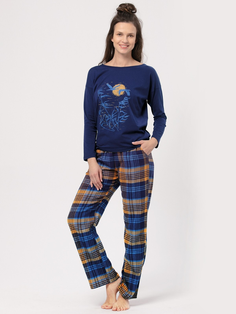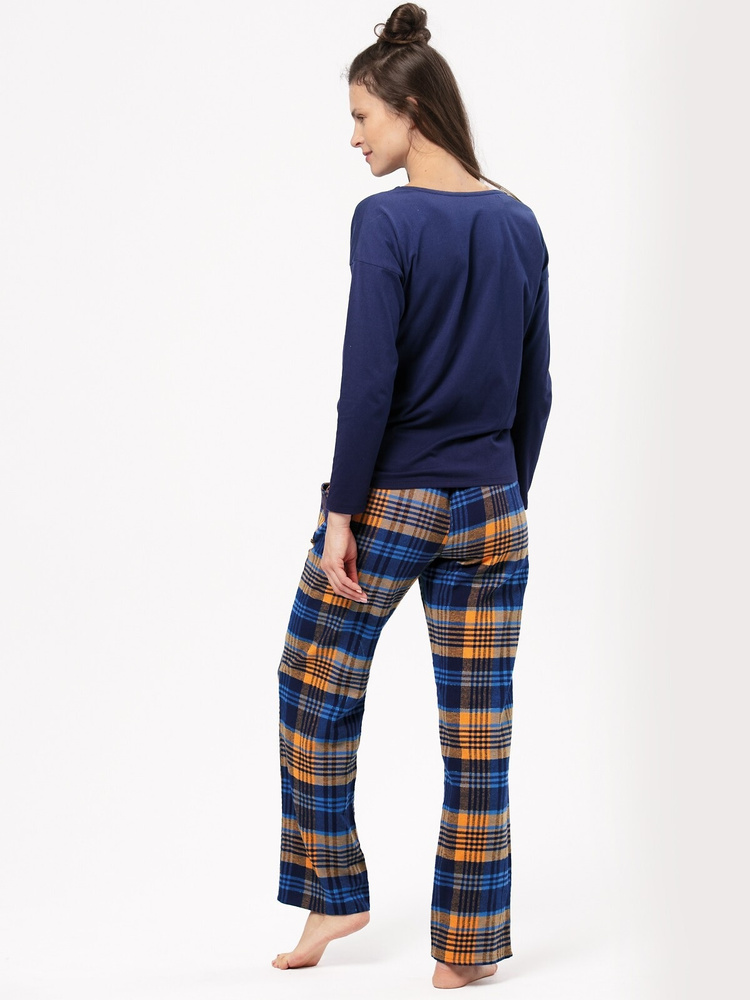 Piżama damska - koszulka z długim rękawem . Dekolt półokrągły. Do kompletu długie wzorzyste spodnie z flaneli z wygodnymi kieszeniami. W pasie gumka obszyta bawełną.
