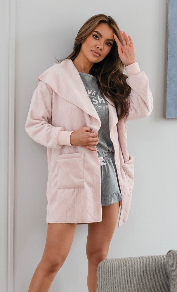 Wygodny, szlafrok damski. Wykonany z miękkiej, puszystej dzianiny typu soft. Model do połowy uda, o prostym kroju z długim rękawem. Na wysokości bioder posiada dwie kieszonki. Bardzo wygodny fason, delikatnie dopasowany do ciała. Spodoba się kobietom, które uwielbiają delikatność i swobodę.