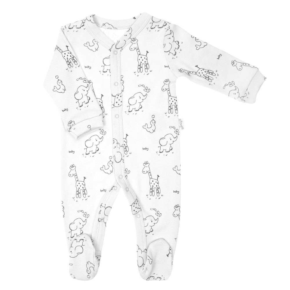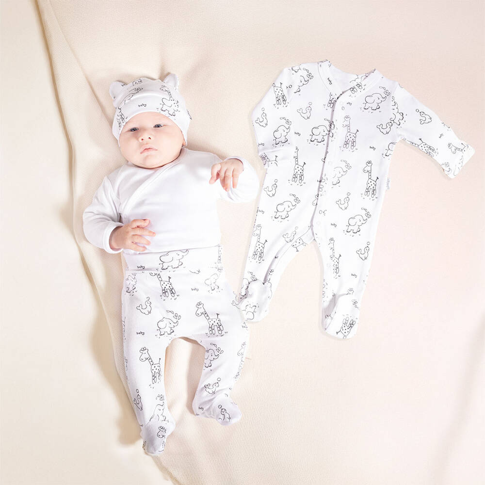 Komplet niemowlęcy, który składa się z półśpioszków, pajaca, czapeczki i body. Zapakowany w pudełko. Całość uszyta z 100% bawełny, ozdobiona nadrukiem zwierzątek.