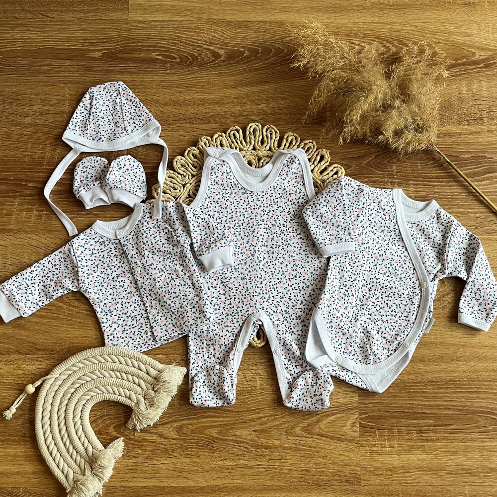 Zestaw wyprawkowy, który składa się z body, śpiocha, kaftana, łapek niedrapek i czapki. Ubranka z 100% bawełny z certyfikatem Bezpieczne dla Dziecka oraz Tekstylia Godne Zaufania. Wyprawka, której nie może zabraknąć u ciebie w domu!