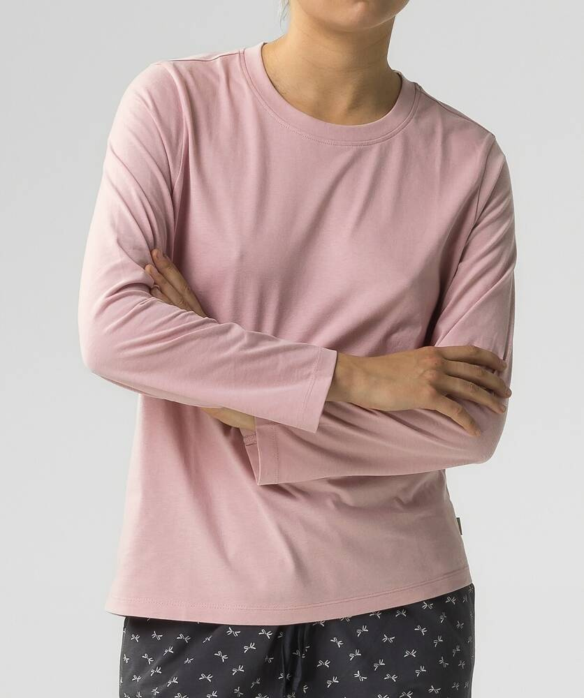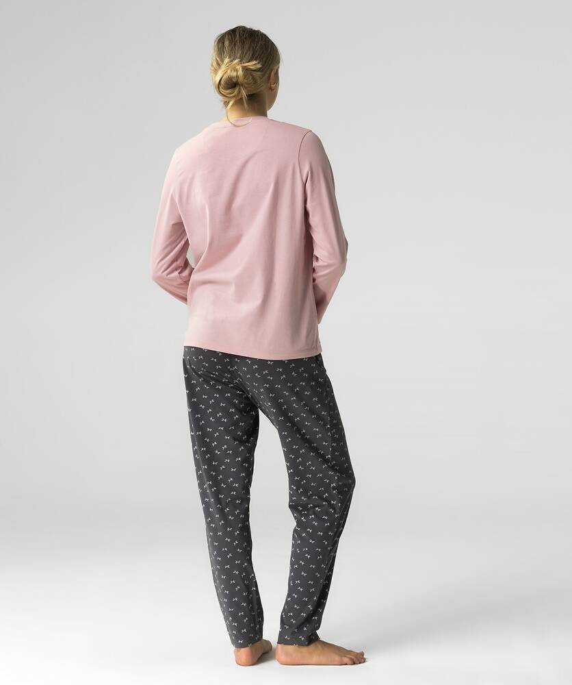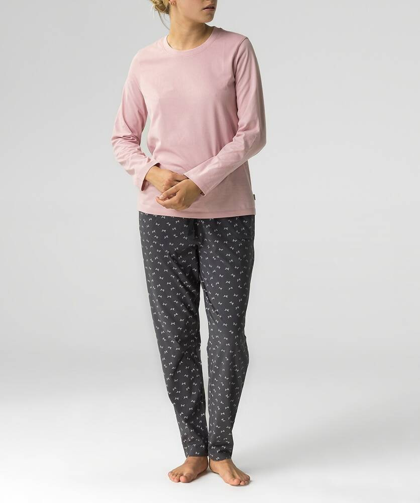 Dla pań, którym zawsze jest gorąco, ulgę i wygodę zapewni stylowa damska piżama z długimi spodniami i długim rękawem. Naturalny, oddychający materiał jest miękki, przyjemny i bezpieczny dla skóry, a prosty krój zapewni wygodę i swobodę ruchów. Zgrabna damska piżama - w bluzie okrągły dekolt , spodnie z funkcjonalnymi kieszonkami.