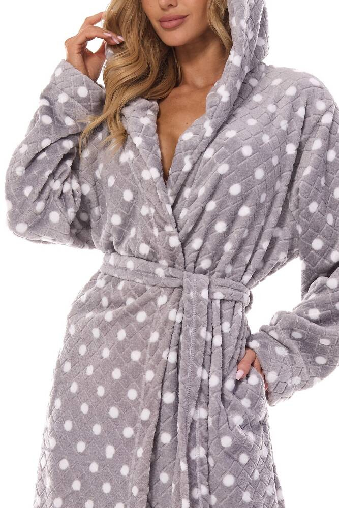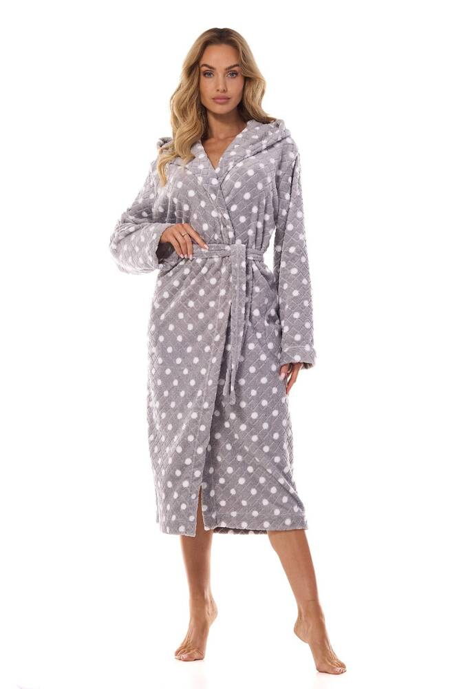 kraj produkcji: POLSKASzlafrok damski długi z kapturem z dzianiny typu super soft w grochy. Wiązany w pasie, na wysokości bioder kieszenie.