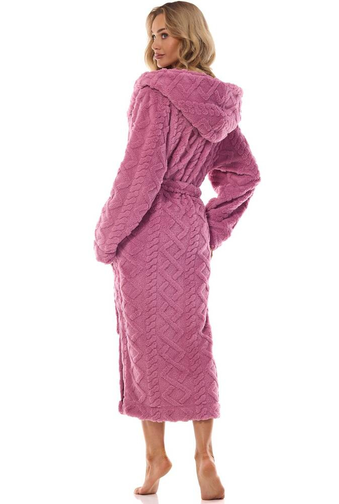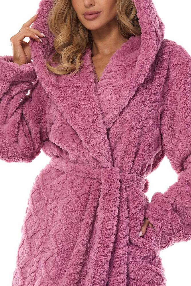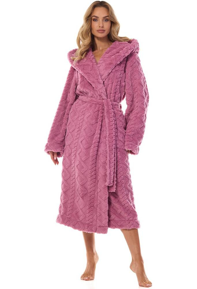 kraj produkcji: POLSKASzlafrok damski długi z kapturem z dzianiny typu super soft miękka dzianina z wytłaczanym, wypukłym wzorem. Wiązany w pasie, na wysokości bioder kieszenie.