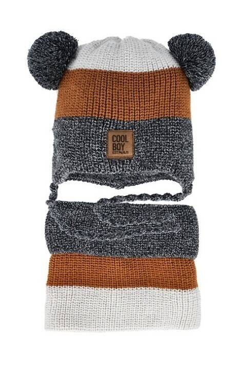Dwuwarstwowy komplet chłopięcy z dwoma pomponami. Do kompletu golf. Idealny na chłodne dni