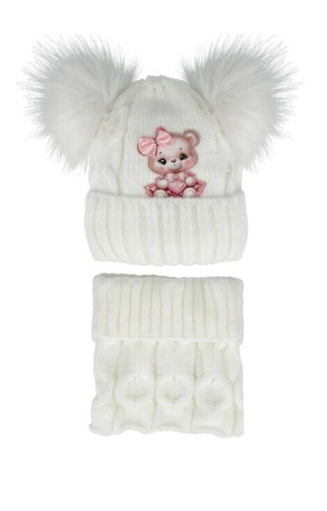 Czapka w warkoczowy wzór, do kompletu golf. Od wewnątrz podszyta bawełną. Model z włochatymi pomponami. Idealny na chłodne dni