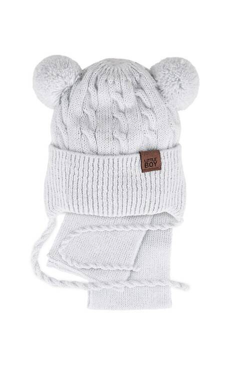 Czapka wiązana pod szyją, do kompletu szalik. Od wewnątrz podszyta bawełną. Model z dwoma pomponami i z wywijanym otokiem. Idealny na chłodne dni